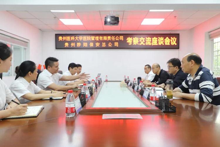 為增進對保安公司營運情況的了解,2021年5月19日,貴州醫(yī)科大學(xué)科技創(chuàng)新與產(chǎn)業(yè)發(fā)展處處長、醫(yī)院管理公司總經(jīng)理涂波等一行三人蒞臨貴州陟翔保安總公司考察交流,集團公司馮波董事長帶領(lǐng)班子成員與考察小組進行座談交流。