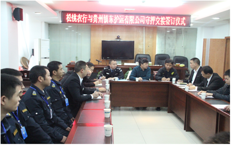 經(jīng)過半年的業(yè)務對接和洽談,銅仁本部于11月16日至20日正式接手德江、石阡、印江、江口、松桃五縣農(nóng)業(yè)銀行守押業(yè)務。銅仁市公安局保安大隊大隊長王世軍、銅仁市農(nóng)行副行長任達輝、銅仁市農(nóng)行保衛(wèi)部經(jīng)理楊猛、銅仁本部總經(jīng)理陳葉、副總經(jīng)理劉興華、劉樹等出席了五縣守押業(yè)務交接儀式。